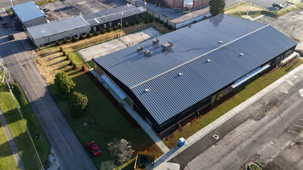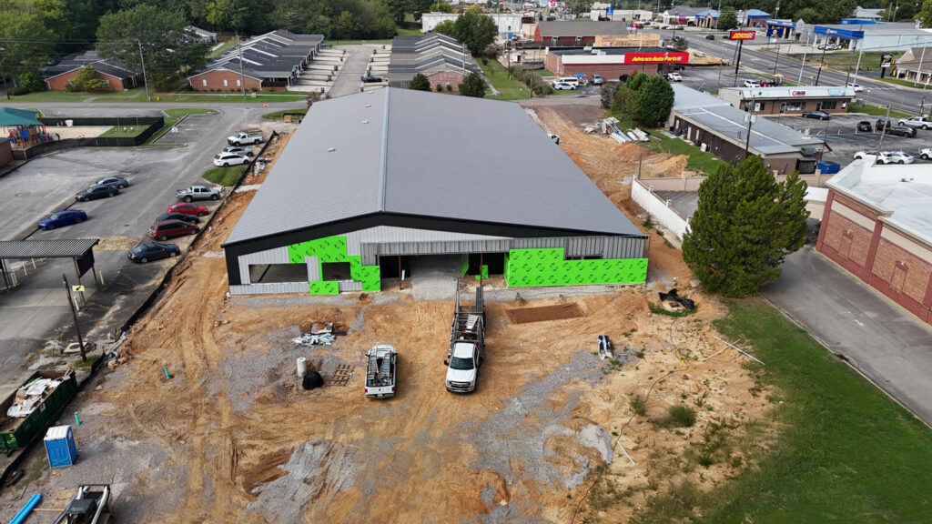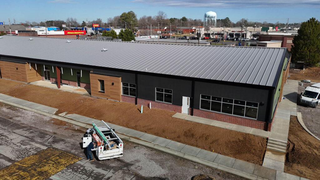 This is a new ground-up project with site work and utilities for a new Class-A health club, complete with full locker rooms, showers, and saunas. The building is a pre-engineered metal building, complete with standing seam roofing and a Simple Saver insulation system. The building is protected with a fire sprinkler system.