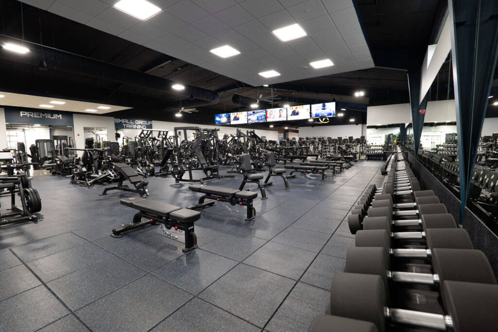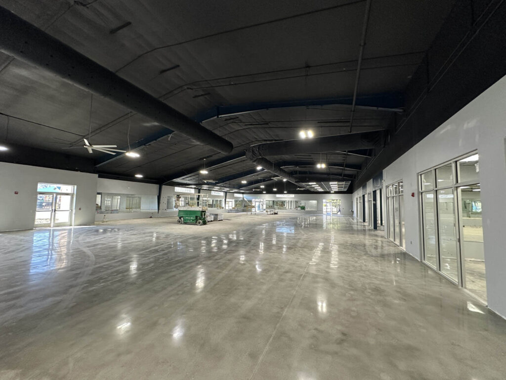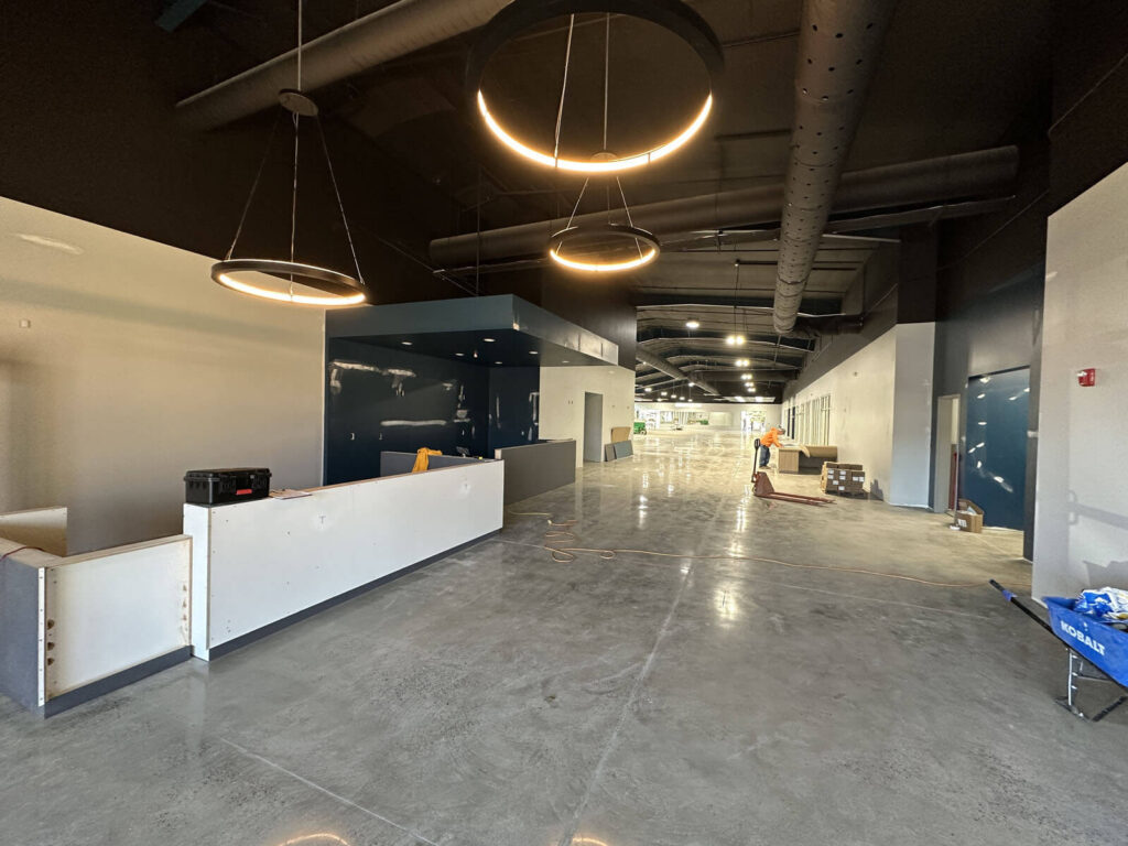 Polished and dyed concrete floors are used throughout, except for the locker rooms, which will receive tile flooring and walls. Padded monster tiles and rubber workout flooring will be installed in the high-use areas. There is also a large childcare facility, complete with study areas, play areas, and an infant nursery area. Big-screen TVs will decorate the walls and corners of the main floor.