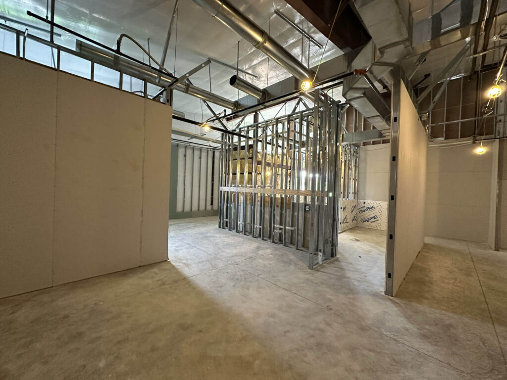There is a large main workout area that is open to the hidden PEMB purlin system, with the creative use of duct sox for HVAC distribution and floating “clouds” for visual effect. The use of Solatube skylights in the open areas aids in bringing more natural light to the main gym floor. Custom wall-to-wall mirrors will be installed in each workout room. Large clear-glazed overhead sectional doors open to some of the workout rooms, along with interior aluminum storefront systems.