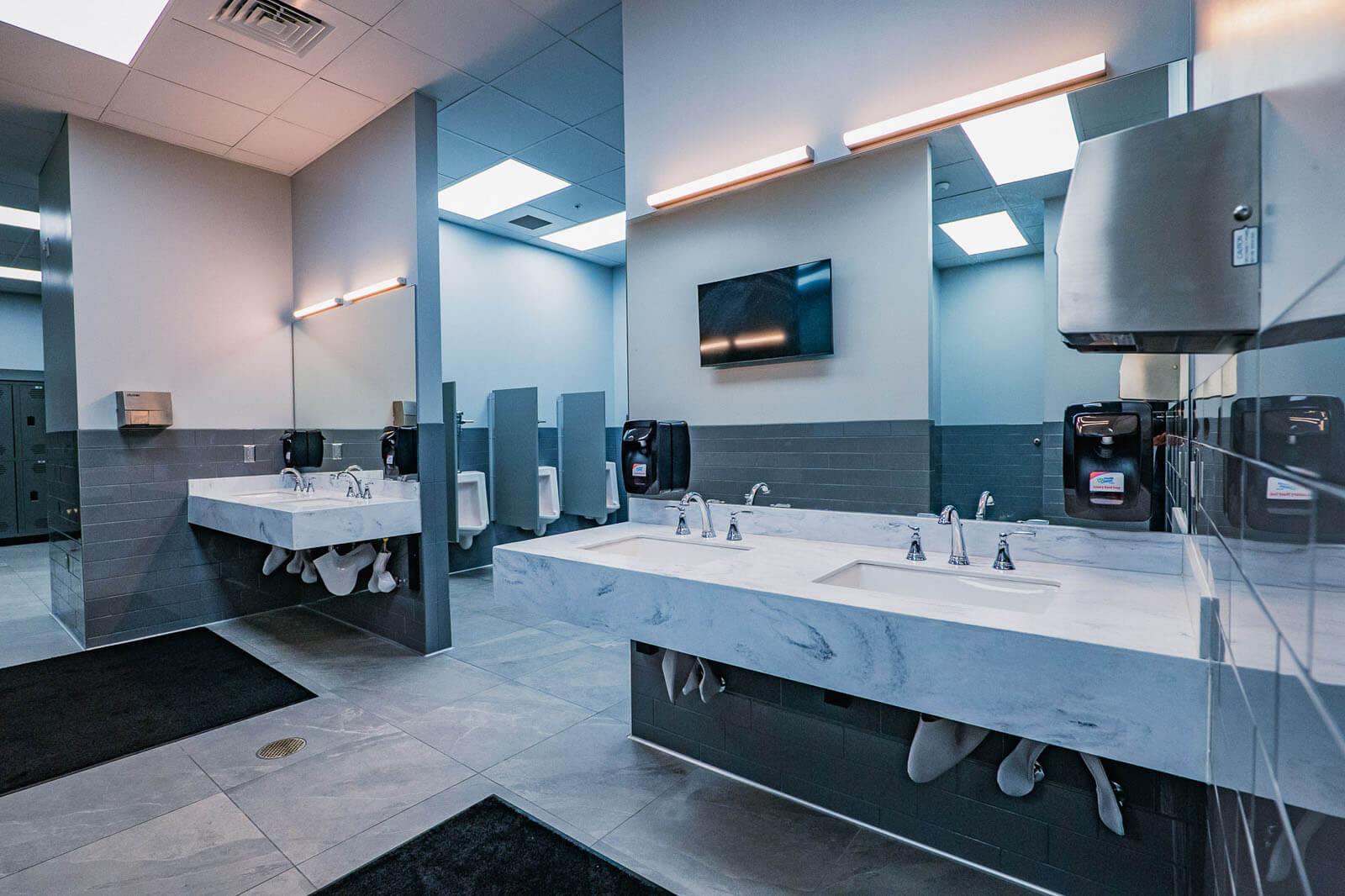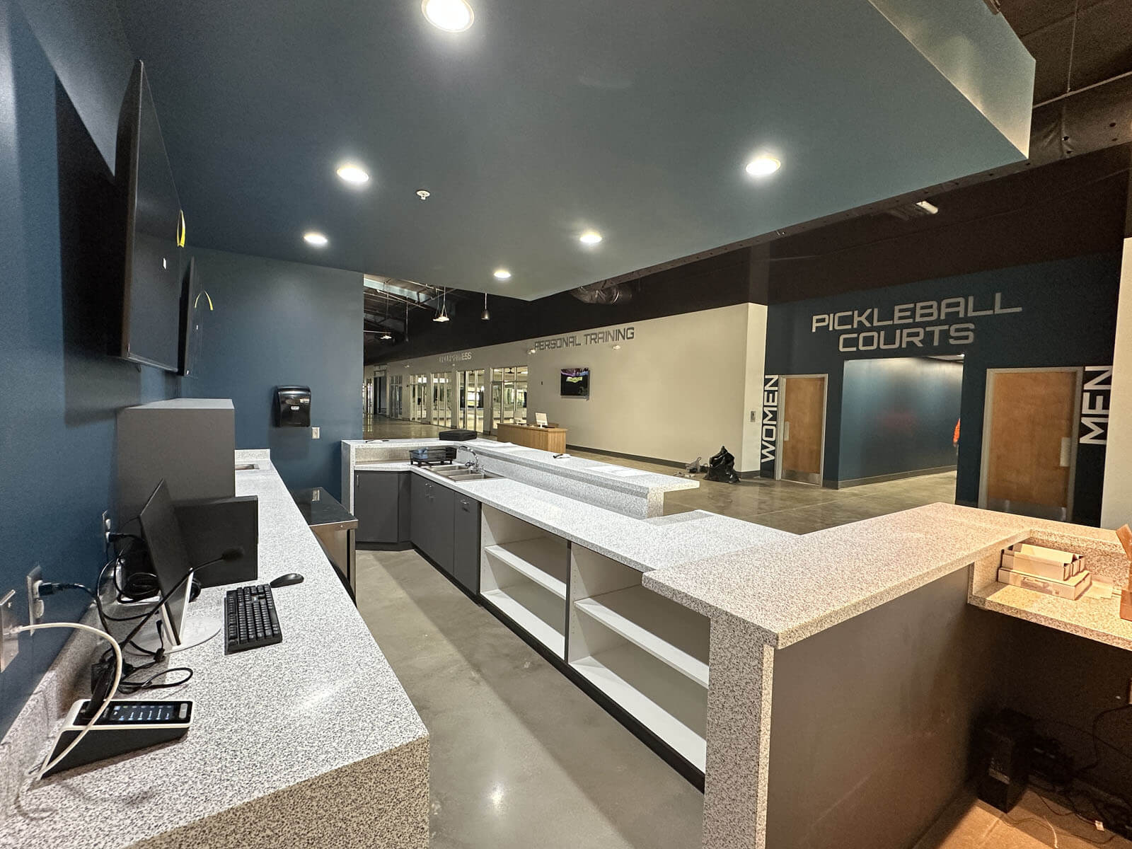 Polished and dyed concrete floors are used throughout, except for the locker rooms, which will receive tile flooring and walls. Padded monster tiles and rubber workout flooring will be installed in the high-use areas. There is also a large childcare facility, complete with study areas, play areas, and an infant nursery area. Big-screen TVs will decorate the walls and corners of the main floor.