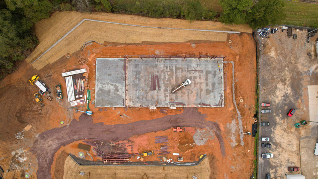 The project consists of ground-up construction with site work, retaining walls, a septic system, and other utilities for a new build. The building structure includes a monolithic slab with a pre-engineered metal building. The PEMB features architectural elements using several wall colors, parapets, and a gable entry. Accenting the entry is an extended metal stud frame with Nichiha wall panels.